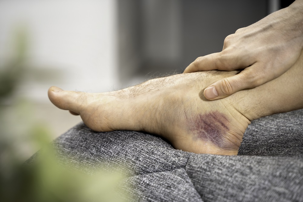 Close-up bruised male ankle with deep blue purple hematoma after leg injury, hand supporting foot on soft gray sofa. Concept of ankle sprain, tissue damage and domestic recovery from physical impact
