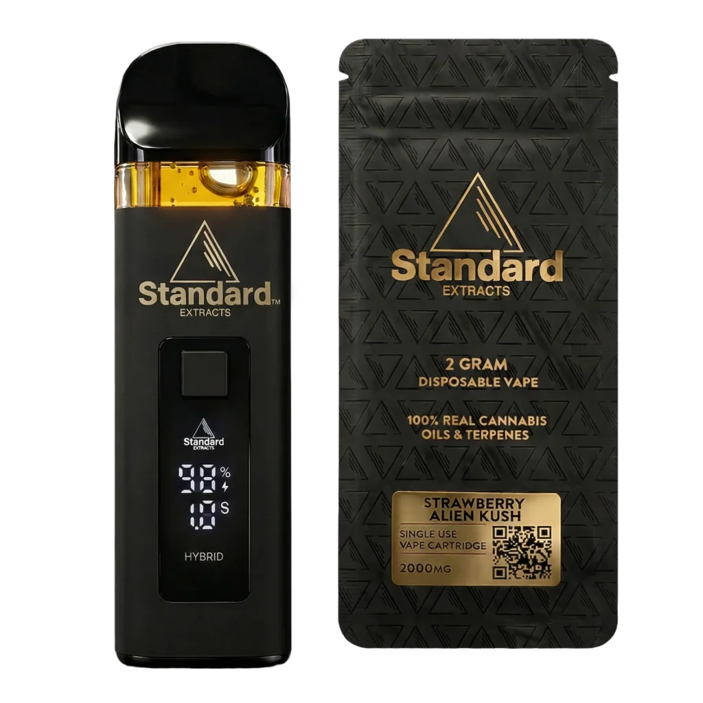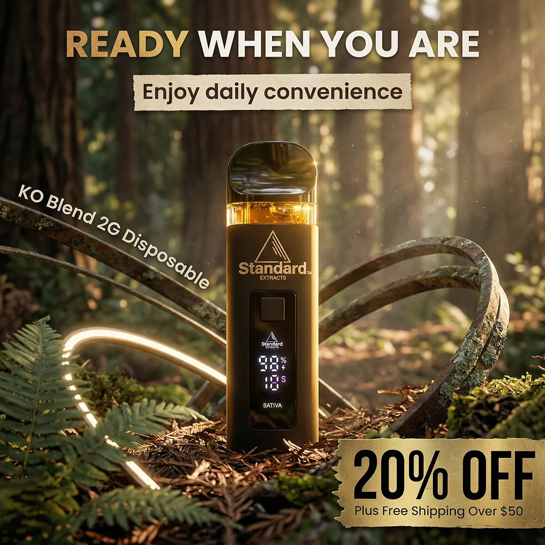 Introducing the Full Spectrum KO Blend Disposable Vape Pen from Standard Extracts. We designed this vape to deliver the ultimate balance of potency, flavor, and smoothness. Each pen contains a powerful mix of Delta-8, HHC, THCP, HHCP, CBD, and CBN, creating a knockout blend that truly lives up to its name.